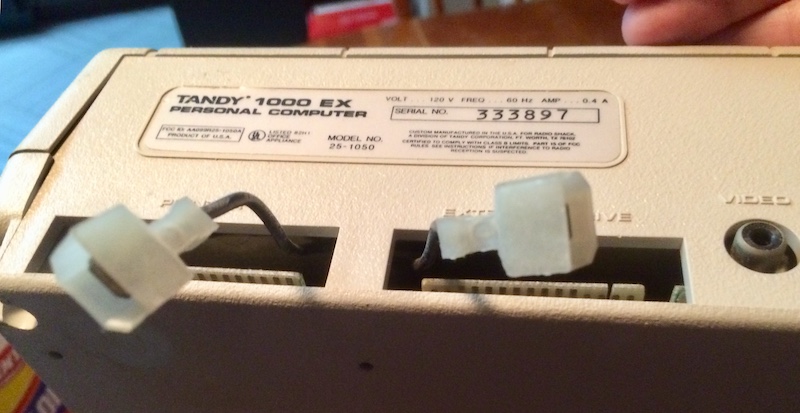 Because the Tandy 1000EX has a hard-wired power cord (a pet peeve of mine), I had to run the board inside the case when I tested it. This meant that the cable arrangement was, well, a little messy: