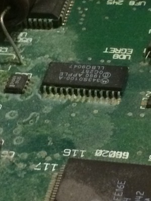 Since the ADB port only appears to have one pin that isn’t working - which is to say, the serial line that provides the actual Apple Desktop Bus - we can probably finger the controller chip as a suspect. Another reason we can point to the chip is that it was recently marinating in extremely corrosive capacitor juice internals.