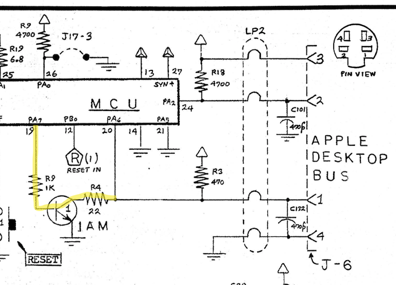 Oh hey, it’s related to the ADB DATA pin that I just patched. And there’s a transistor on the line (not explicitly called out as Q3, but that’s a pretty strong coincidence). Let’s patch this, too!