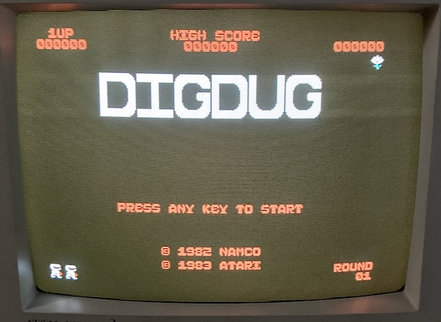 The Dig Dug title screen looks good. It asked me if I wanted “full colour mode,” and I answered yes, thinking that meant 4-bit colour, but then everything turned orange-y.