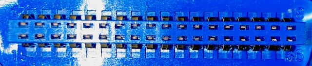 Unfortunately, I also put the 50-pin header onto the board backward, so the ribbon cable had to go into and then back out of the board, which is a little awkward. This was one of those things I couldn’t have figured out unless I had the cable in hand. I used a pre-made 50-pin 0.1” ribbon cable that I found on Amazon, and then cut one of the pin-header ends on and crimped on a card-edge header that I also got from Amazon. Unsurprisingly, fixing the board in version-2 so that the connector now pointed the right way made the routing way easier! There’s that “gift from the original designers” again.
