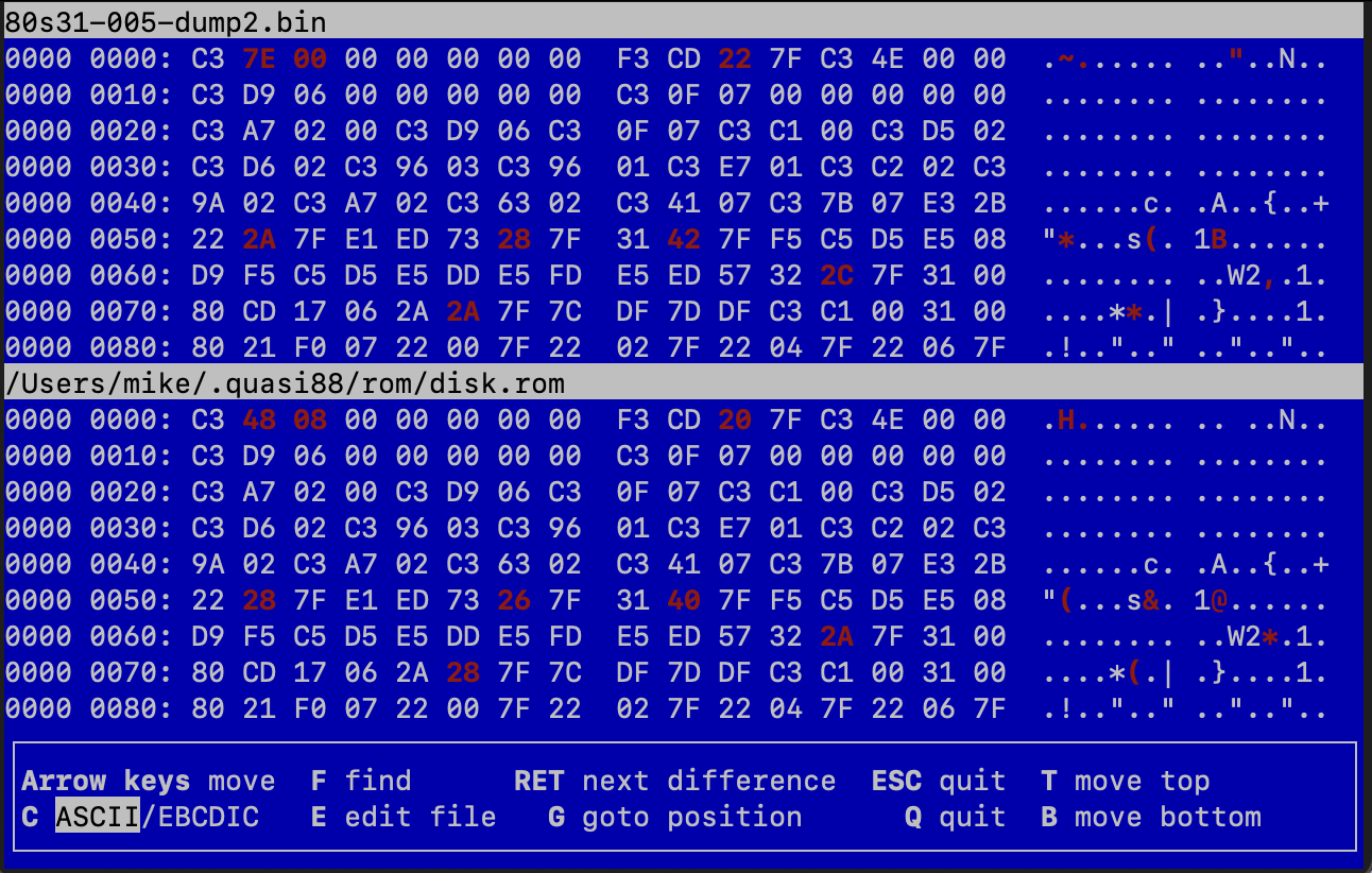 That does not look like the same ROM at all. Or at least, it looks like a similar ROM, but with wildly different addresses in it. Things don’t get any better further into the ROM, which makes me agree that the PC-8801mkII disk ROM is a descendant of the 80S31 ROM but is not necessarily the same one.
