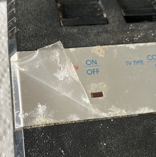I also wanted to clean up the shiny logo band on the front of the case. I was surprised to find that the original protective film is still stuck to it! Unfortunately, the white gunk wasn’t entirely removed along with the old film. I had to go very carefully through here, because I was worried that isopropyl alcohol would damage the screen printing.