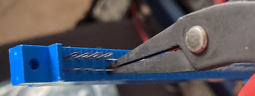 Instead of doing it the fast way, I used my trusty Hakko PN-2007 needlenose pliers to pre-bend the pins by hand. It felt like it took a long time, but it only took about a minute. Now, when I inserted the PCB, the pins all made good mechanical contact with the footprints.