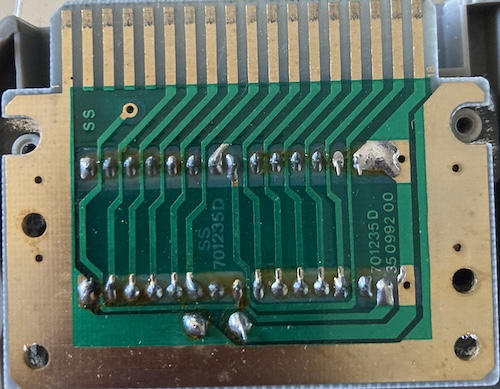 I spent a half-hour taking measurements of the shell and PCB using a cheap digital caliper. Then I set about buzzing out the cartridge, using the known pinout of the ROM to guess what each pin on the edge connector did.