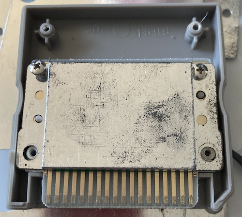 When opening the charmingly floppy-disk-shaped cartridge, the first thing I saw was… another RF shield. They were really paranoid about it if they were trying to insulate a mask ROM from producing unwanted interference.